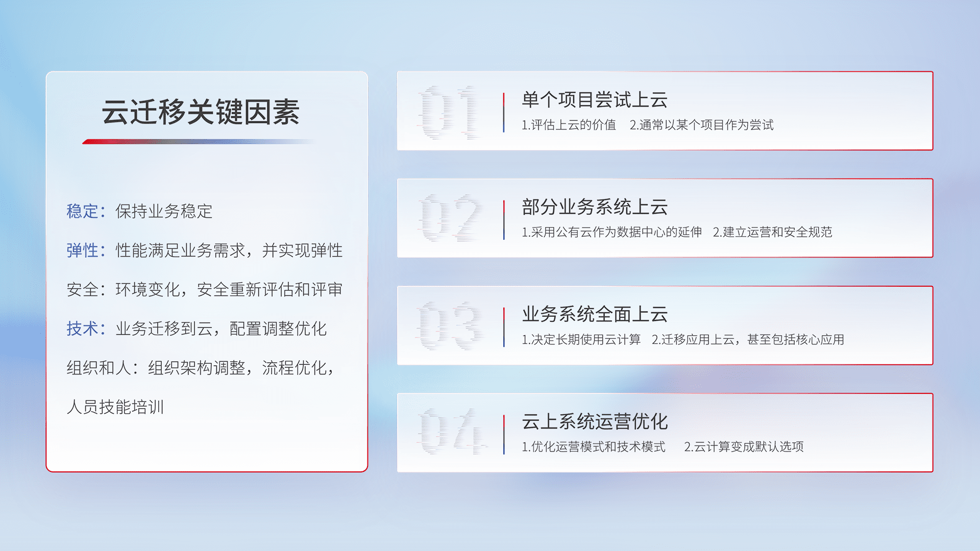 结合实际业务,,,,从规划设计、、、云平台选型、、云原生改造、、、数据迁移、、集成交付,,,迁移全过程为客户识别最佳上云路径,,,做好风险识别管理,,,设计网络架构、、、、身份权限、、安全审计合规、、、、操作审计、、、、日志审计、、监控告警策略、、、多站点容灾设计等,,,,对云上基础设施进行整体规划,,,提升IT治理水平,,,,以满足弹性、、、高可用、、、、高性能的需求。。